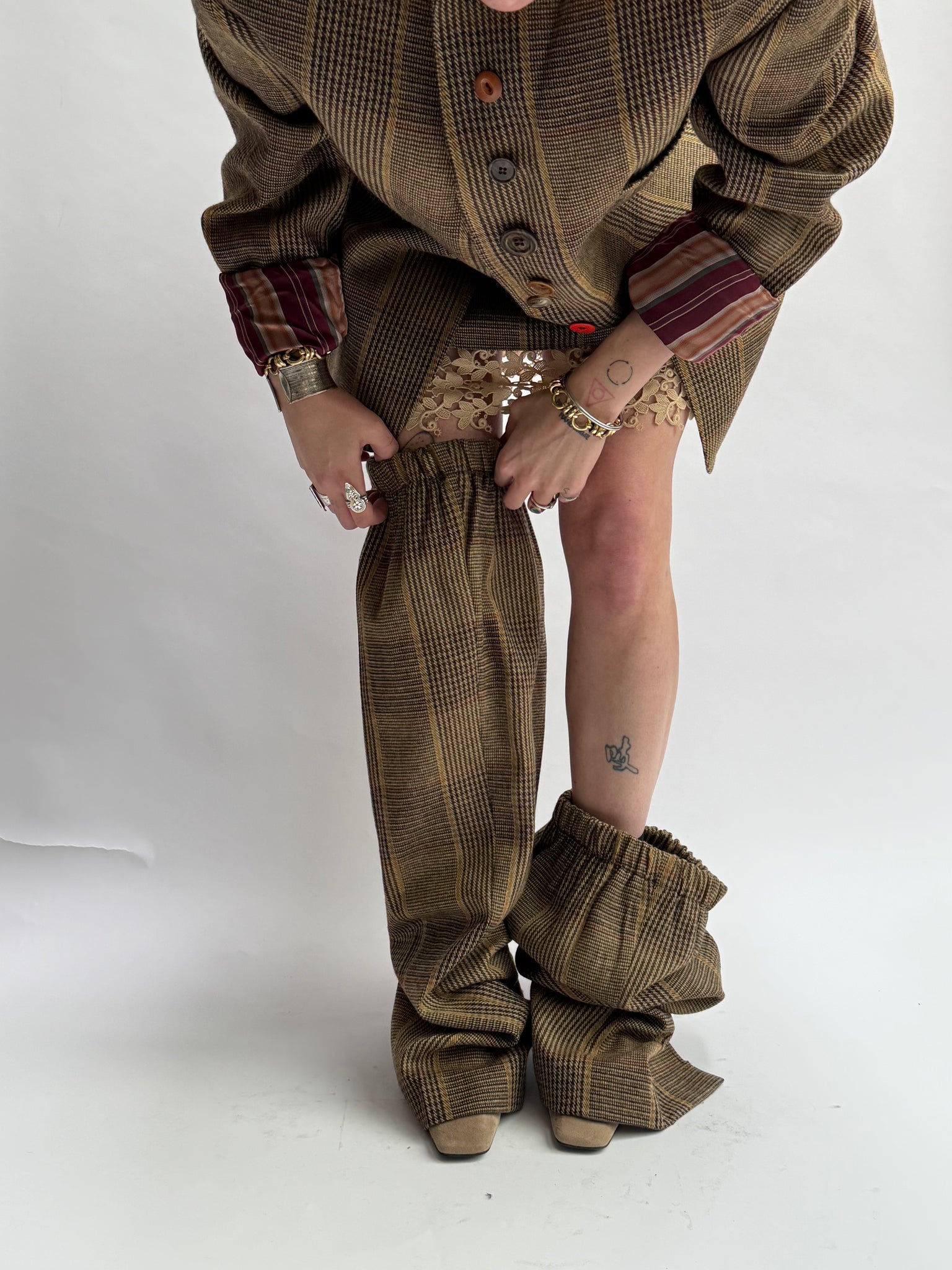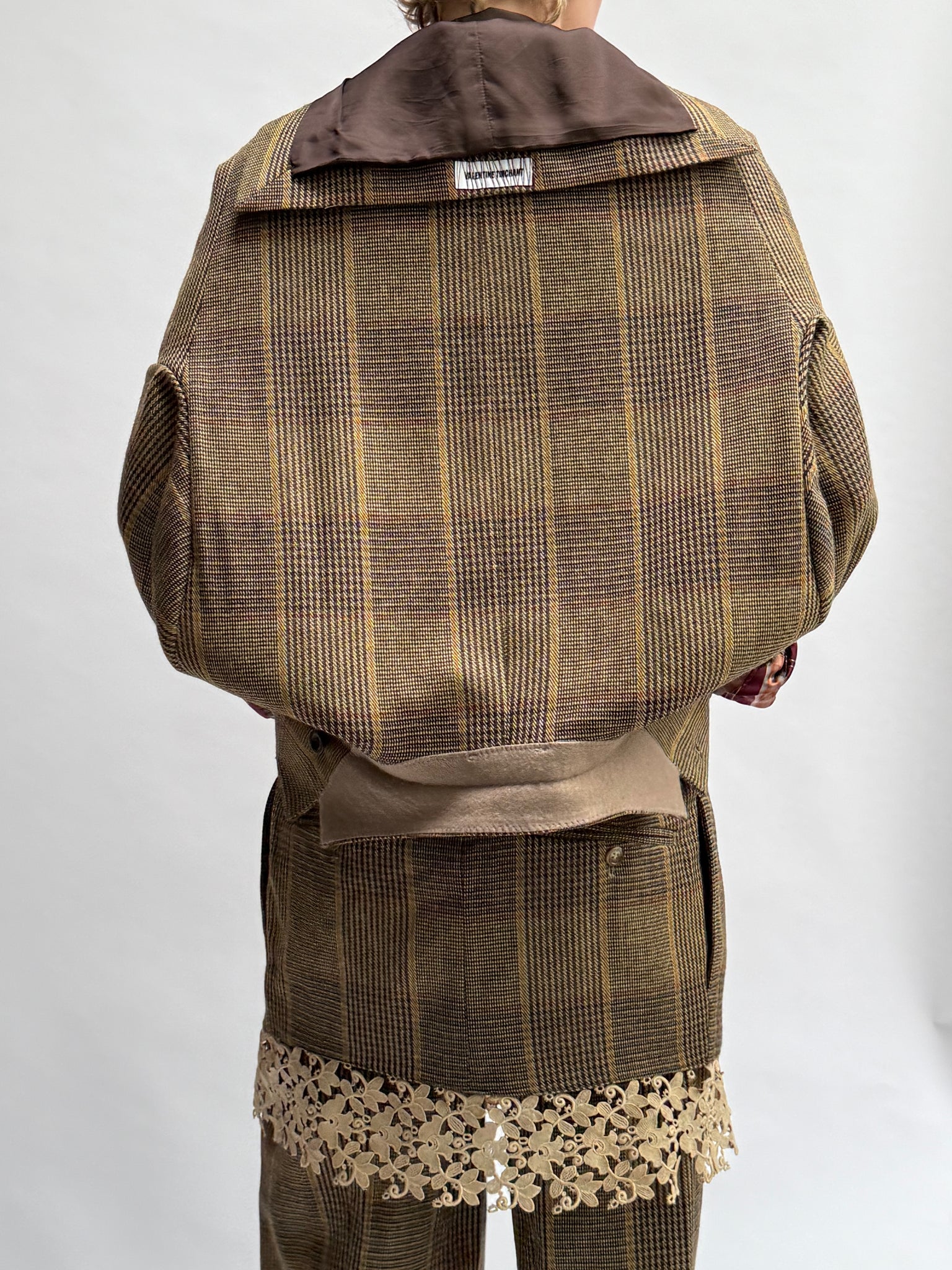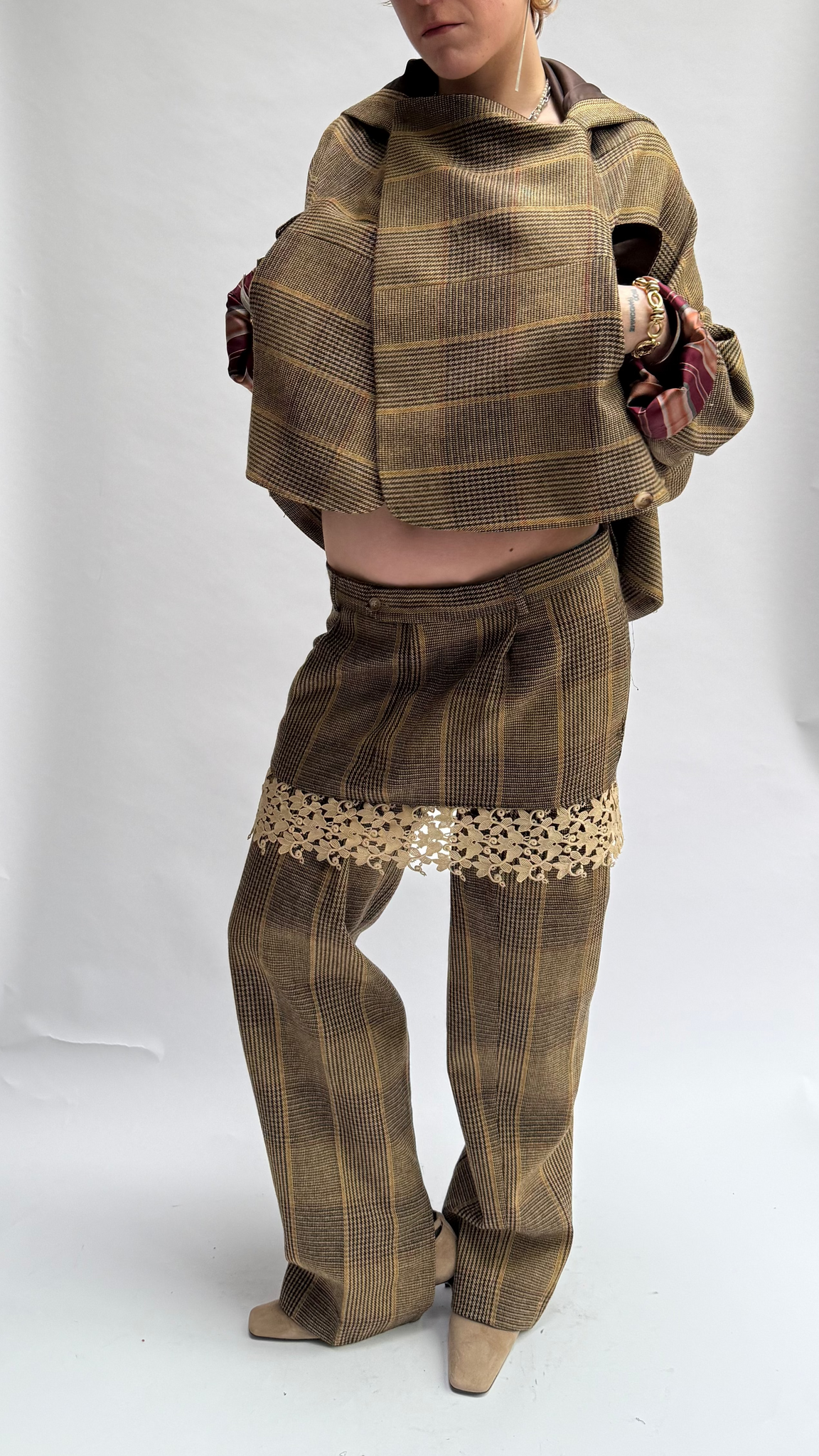 * The upside down suit is a vintage scapa men's suit that Valentine upcycled in a more feminine way by respecting the beauty there already was. It exists of a skirt, legwarmers that you can also wear as sleeves and a blazer, that is meant to be worn upside down, as a kind of bomber. Finished with 2 press buttons to close the jacket on the top, still keeping it possible to wear as a regular blazer.