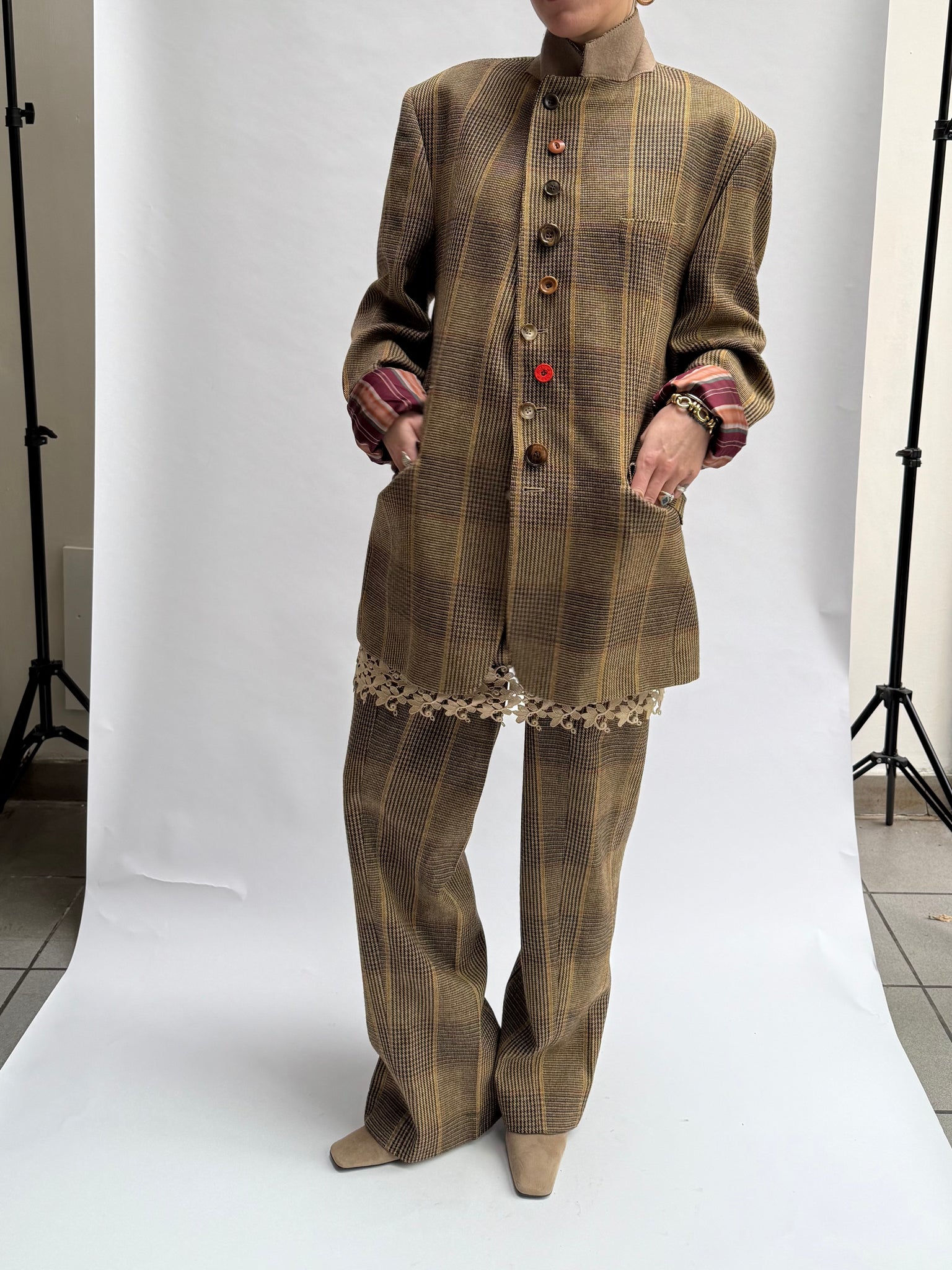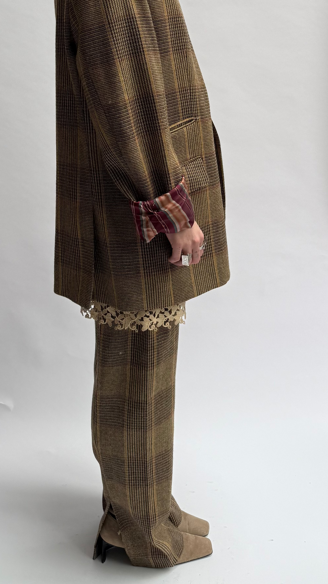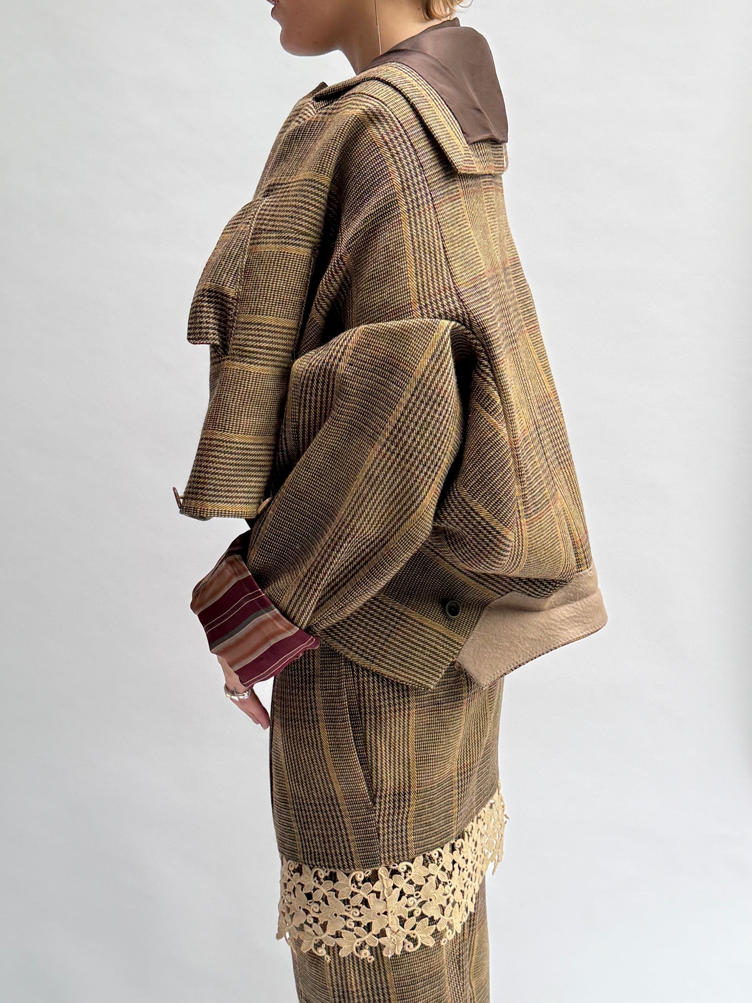 * The upside down suit is a vintage scapa men's suit that Valentine upcycled in a more feminine way by respecting the beauty there already was. It exists of a skirt, legwarmers that you can also wear as sleeves and a blazer, that is meant to be worn upside down, as a kind of bomber. Finished with 2 press buttons to close the jacket on the top, still keeping it possible to wear as a regular blazer.
